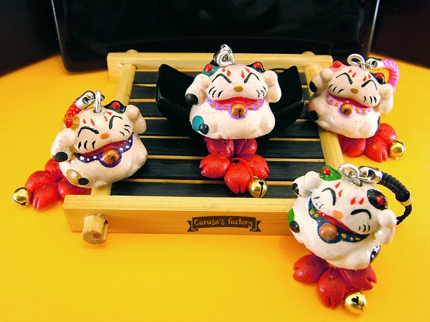Hoy la fábrica de Sir Caruso viaja a Japón, concretamente para traeros estos pequeños y regordetes gatitos de la suerte hechos a mano y customizados a nuestro gusto con una preciosa flor de sakura roja y un cascabel dorado cosido en hilo, imitando al cascabel del collar que sirve para espantar el mal yuyu :D